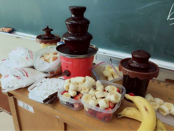 没错,这班男同学们对女同学们的感恩,就像这个巧克力喷泉一样汩汩的流个不停。