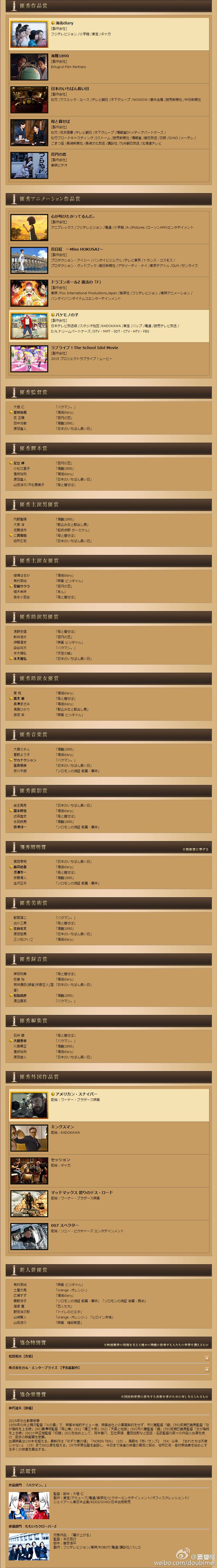第39届日本奥斯卡奖于1月18日公布了正式奖项15个部门的优秀奖,以及包括新人演员奖在内的编外奖项获奖名单。由是枝裕和导演的《海街日记》共获得12项优秀奖成为本届的大赢家,此外山田洋次导演新作《若与母亲同住》,原田真人导演的《日本最长的一天》分获11项优秀奖,紧随其后,最近刚刚发售的Blu-ray和DVD的「怪物之子」获得了最佳动画电影。