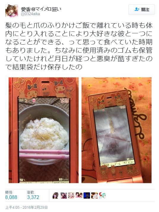 ▼而最令人吃惊的莫过于这则贴文:「当我和男友分离的时候,我便会把这些东西拿来下饭…。对了用过的保险套我也有留着,但因为时间久了就变得非常臭,所以我就用小袋子装着。」