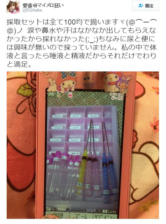 ▼「用具都是在百元商店买的喔。不过男友的泪水还有鼻水很难採集,所以目前还没有。另外我也对尿液还有粪便没有兴趣,所以也没有搜集。我能从我的身体内採集到男友的唾液和精液,这样我就挺满足的说。」