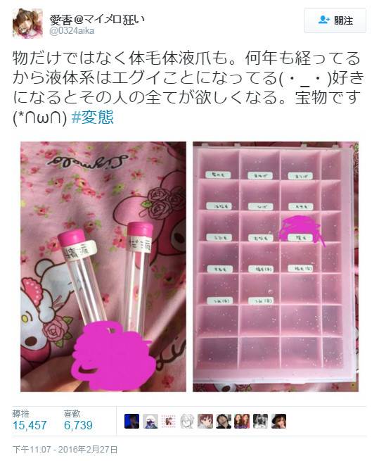点开她的推特便能看到她在自我介绍写着:「最大的兴趣是体毛体液和指甲」,随着她在推特上放上蒐藏品,网友们更是惊觉她的兴趣可不是随便说说。