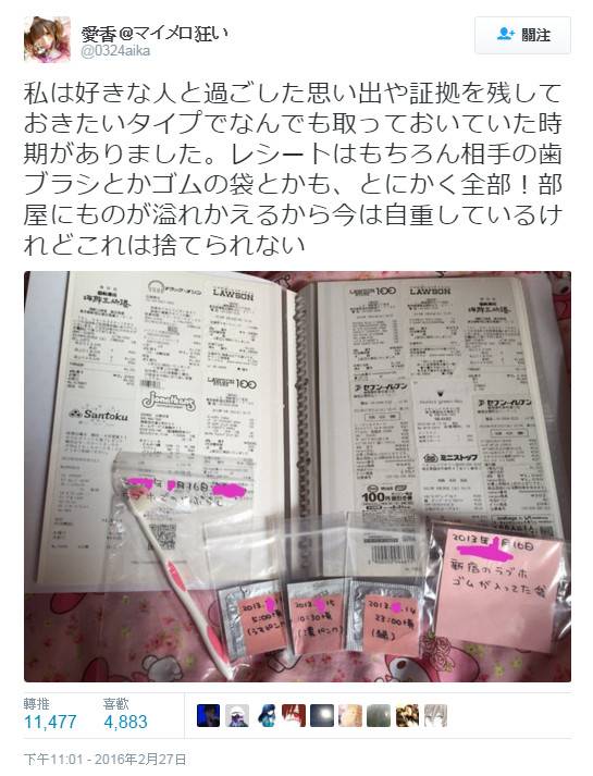 ▼她展示了包括对方的收据(贴了满满一本,几乎是帮对方记帐了吧?)、用过的牙刷以及保险套的包装袋等,几乎是男友不要的垃圾几乎都在女孩子这里。