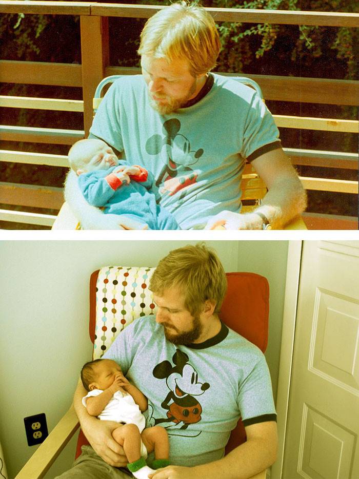 ▼我爸29岁时跟两周大的我 VS 29岁时的我和我两周大的儿子(还真有默契)