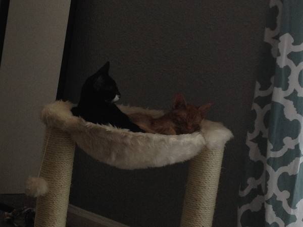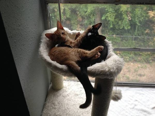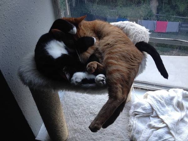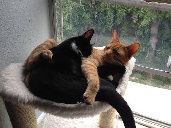 不过牠们俩姊妹不是今天的主角,今天的主角是一橘一黑的猫兄弟。橘色Barnaby和黑色Stoche是两只被认养来的猫咪,牠俩的兴趣就是挤在一起ㄎㄟˋ修睡觉觉。
