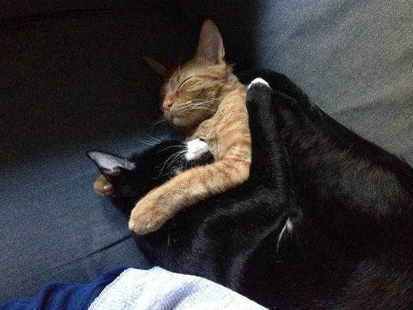 ▼有时候是橘猫压黑猫…反正牠们就是能调整到最苏胡的姿势~