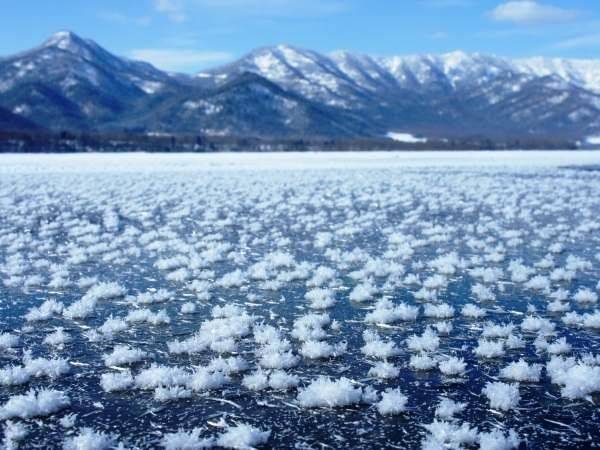 霜花是水蒸气经由冷却、在寒冷湖面上所结成的冰晶,随着更多蒸气逐渐形成如手掌般大小的结晶体,又称为「冬之花」,轻轻一吹就会融化。阿寒湖受到湖底涌出温泉的影响,冬季湖面的冰层仅薄薄一层,容易形成霜花,也因此成为12月到3月间的着名景点。