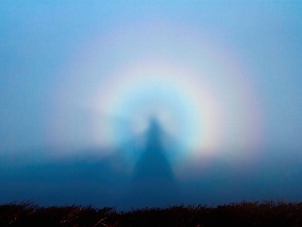 当太阳自观看者身后照下,光线穿过的地方受到云雾干扰时,便在人影周围产生彩虹光轮,是一种光环现象,当站在山顶时,这种幻象会更加强烈。日本从古时候开始,认为这是背后背着一轮光环的阿弥陀如来现身,便称呼其为「御来迎」。