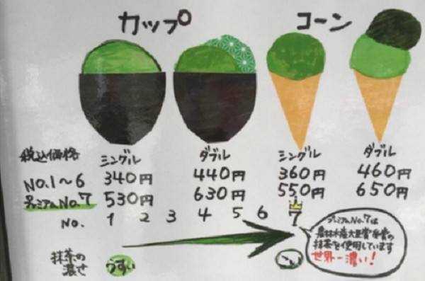 换句话说,依照每个人口味的不同,世界上最棒的抹茶也不同,来到「寿々喜园」的客人,可依照自己的喜好从"最淡的1号口味"吃到"最浓郁的7号",而且这家的7号口味还是世界上最浓郁的抹茶喔!是不是超酷的?