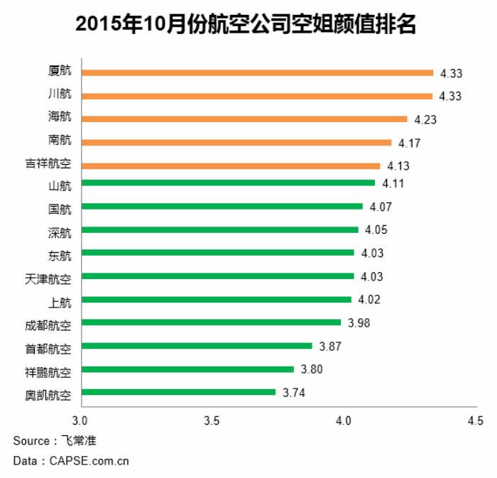 据航联传播旗下民航旅客服务评测(CAPSE)飞常准10月份数据显示,在旅客眼中厦航、川航的空姐颜值得分最高为4.33分(满分4.5分),海航空姐则其次为4.23分。