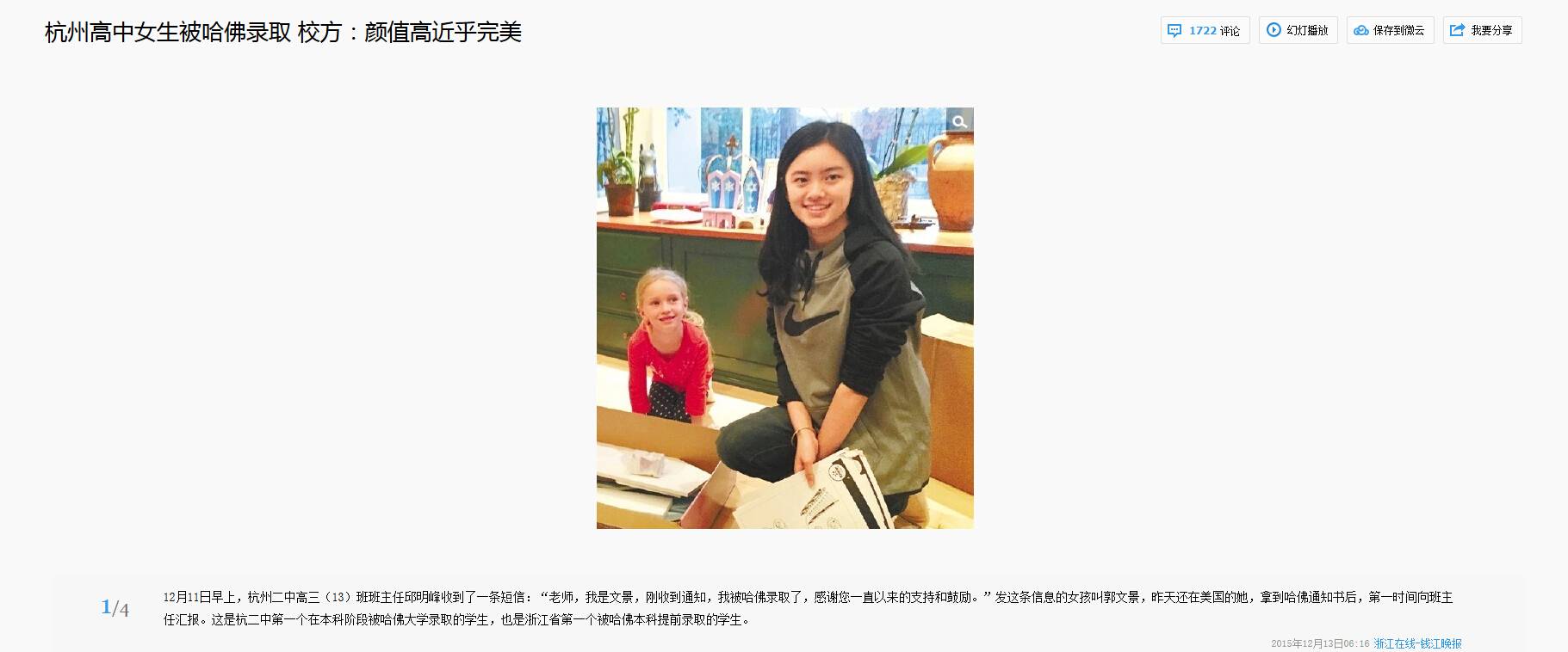 12月11日早上,杭州二中高三(13)班班主任邱明峰收到了一条短信:“老师,我是文景,刚收到通知,我被哈佛录取了,感谢您一直以来的支持和鼓励。”发这条信息的女孩叫郭文景,昨天还在美国的她,拿到哈佛通知书后,第一时间向班主任汇报。这是杭二中第一个在本科阶段被哈佛大学录取的学生,也是浙江省第一个被哈佛本科提前录取的学生。