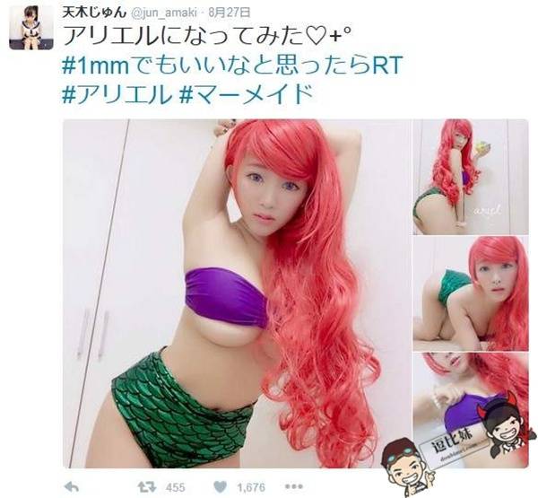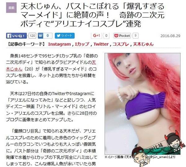 上次她参加节目穿了根本就穿不下的制服造成话题之后,这两天天木纯又以一席小美人鱼的cosplay打扮造成话题,超少的布料加上超大的胸部,许多日本网友都认为这可能是角色扮演中欧派最大的小美人鱼爱丽儿了!