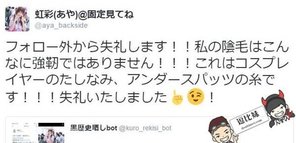 结果虹彩的推特瞬间充满关于阴毛的话题,差点被冠上「刚毛COSER」的称号!她本人干脆直接在个人简介澄清……