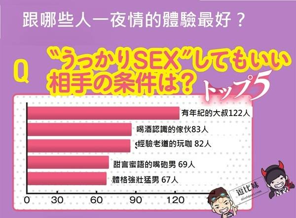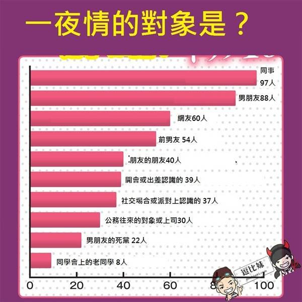 在现代这个开放的社会发生一夜情已经不是什么稀罕事了,但你知道女生最容易跟哪些对象发生一夜情吗?以及对哪些身份的一夜情对象最满意呢?日本网站近来调查了200位女性的一夜情经验,有了重大的发现: