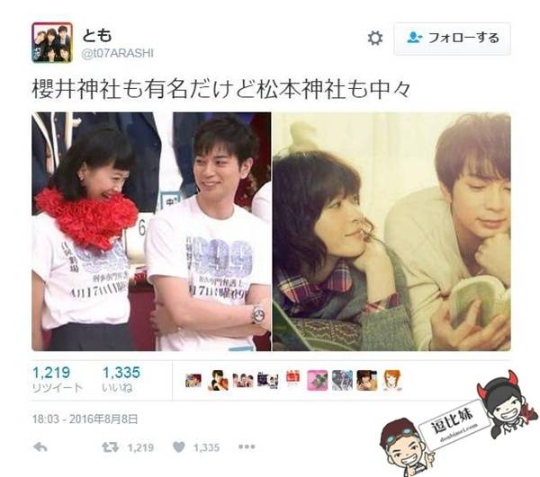 而这荣仓奈奈结婚的消息出来后,也立刻让网友想到她和5月宣布结婚的上野树里一样都前后跟松本润有过合演~自然继「樱井神社」后,就接着出现「松本神社」的说法