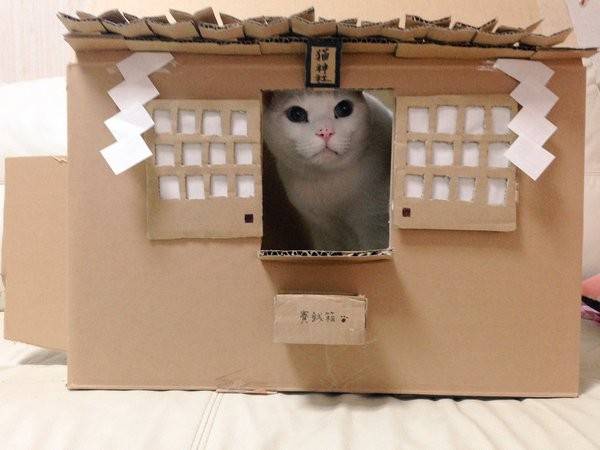 主人还帮牠用纸箱做了猫神社呢~自己的饲料钱自己赚的概念!!
